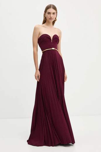 Abito red carpet in jersey lurex plissettato con cintura.Abito red carpet in jersey lurex con scollo a cuore e coppe rifinite da fascia plissettata. Il punto vita è enfatizzato da una cintura in maglia metallica elastica con placca logo in metallo dorato che sovrasta l'ampia gonna svasata.
