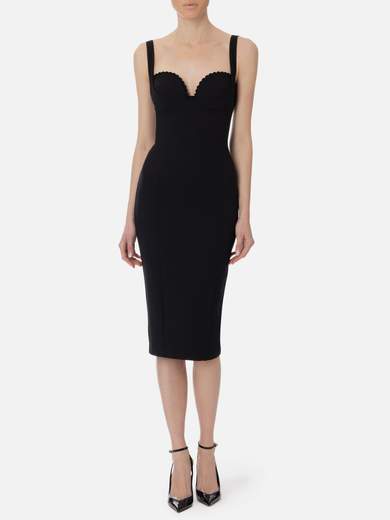 Abito in doppio crêpe stretch con smerlo ricamato.Abito in doppio crêpe stretch. Il vestito ha spalline e gonna midi. Essenziale e sofisticato grazie alle cuciture lineari sul davanti e sul retro, a disegnare una silhouette armoniosa. Il dettaglio di stile è lo smerlo ricamato sulle coppe, impreziosito da un piccolo fiocco in tono. Vestibilità aderente.