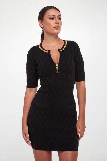 Mini abito in maglia a rombi con dettaglio gioiello.Mini abito in maglia dalla vestibilità aderente. Il vestito ha girocollo, maniche sopra al gomito e si distingue per l'elaborata lavorazione 3D che crea un disegno geometrico a rombi su tutta la lunghezza. Impreziosito dalla catena groumette, ha scollo con zip e tirazip gioiello con logo.