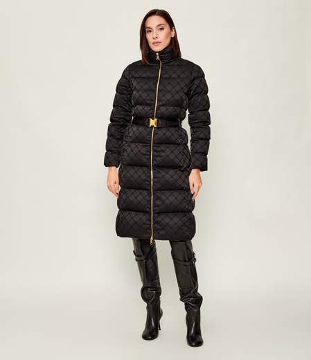 Piumino lungo tessuto in vela dalla vestibilità regular. Presenta collo con sciarpa imbottita e amovibile e tasche con zip invisibile. Il pattern all-over con losanga jacquard rende la texture preziosa. Cintura in vita con fibbia per definire il punto vita.