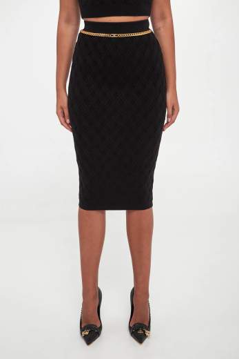 Gonna in maglia a rombi con dettaglio gioiello.Gonna a tubo in maglia dalla vestibilità aderente. Con vita alta, si distingue per l'elaborata lavorazione 3D che crea un disegno geometrico a rombi su tutta la lunghezza. Impreziosita dalla catena diamantata con logo e strass che decora il punto vita.