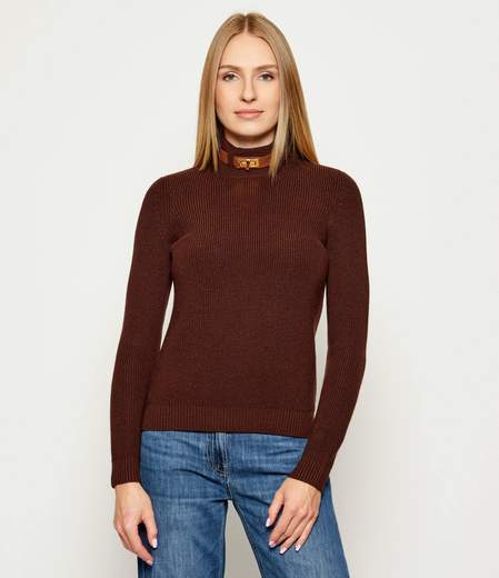 Maglia in misto lana con cinturino gioiello.Maglia in misto lana dalla vestibilità regular. Arricchita dal cinturino con girello in metallo dorato, infilato nei passanti e sormontato dal dettaglio ambrato con effetto tartaruga. I bordi sono rifiniti a coste inglesi.