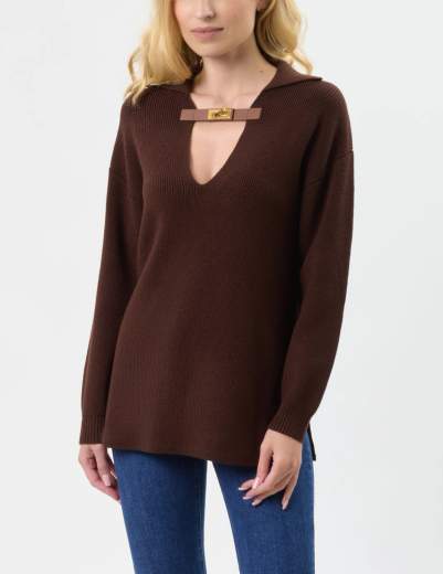 Maglia in misto lana con cinturino gioiello.Maglia in misto lana dalla vestibilità regular. Con colletto e ampio scollo a V, è arricchita dal cinturino con girello in metallo dorato, sormontato dal dettaglio ambrato con effetto tartaruga. Bordi e spacchi laterali sono rifiniti a coste.