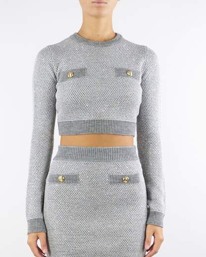 Top in maglia con paillettes.Top in maglia dalla vestibilità aderente. Con girocollo e maniche lunghe, si distingue per la texture con paillettes in trama a donare riflessi preziosi. Rifinito con filetti e bordi lavorati a costine, ha bottoni gioiello con logo per un'ultima nota luminosa.
