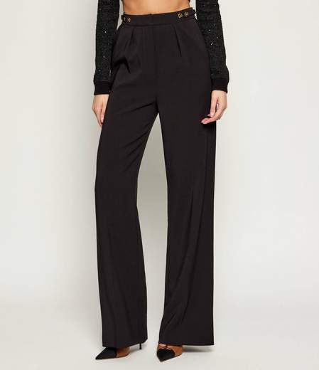Pantaloni in crêpe con accessorio gioiello.Pantaloni in crêpe dalla vestibilità regular. Con piega al centro e tasche alla francese, hanno dettagli in metallo dorato che impreziosiscono i fianchi e il retro della vita.