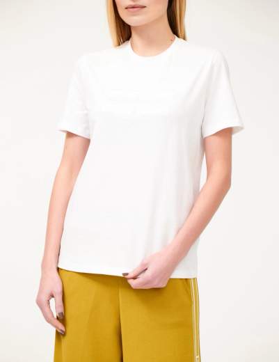 Maglietta a maniche corte in jersey di cotone con vestibilità regular. Il capo è impreziosito dal logo frontale, ottenuto con ricami in filo e infine illuminato da una essenziale cornice di strass trasparenti.