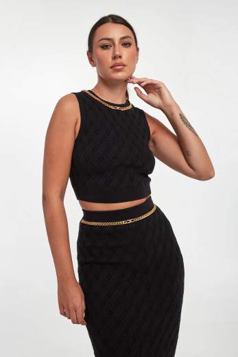 Top in maglia a rombi con dettaglio gioiello.Top in maglia a rombi dalla vestibilità aderente. Si distingue per l'elaborata lavorazione 3D che crea un disegno geometrico a rombi su tutta la lunghezza. Impreziosito dalla catena groumette, ha scollo con zip e tirazip gioiello con logo sul retro.