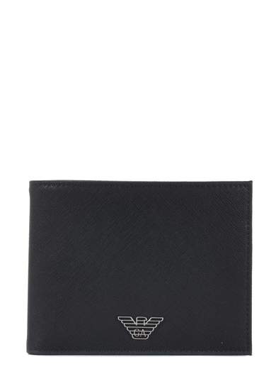 Portafoglio Emporio Armani in ecopelle motivo saffiano Nero. Logo eagle metallico applicato sul davanti. Interni foderati. Tasche porta tessere. Scomparto per le banconote e per monete.