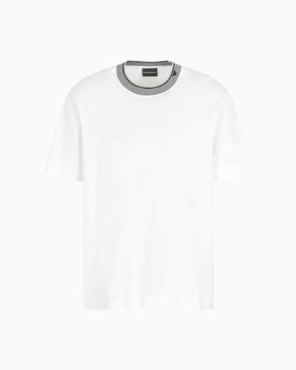 T-shirt girocollo in jersey di cotone, caratterizzata da profilo a contrasto in maglia motivo millerighe con micro aquila ricamata.Tessuto: 100% cotone