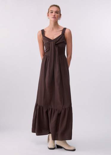 Abito lungo in misto lino.Quest'abito in misto lino, fresco e traspirante, ha spalline larghe e una costruzione che valorizza il punto vita. Davanti è essenziale, dietro sorprende con un maxi fiocco, perfetto da indossare con sandali flat per il giorno o con tacchi per un look serale.