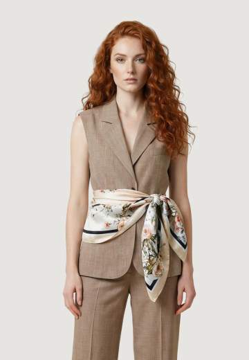 Il gilet rappresenta la perfetta unione tra eleganza contemporanea e comfort sartoriale. Il design con taglio maschile e revers classico, senza maniche, regala un look sofisticato e moderno, ideale per l’ufficio, eventi formali o occasioni speciali. Il dettaglio del foulard annodato in vita aggiunge un tocco di romanticismo e femminilità, valorizzando la silhouette. La qualità tipica del brand Liu-Jo si esprime nel fit curato e nella versatilità di abbinamento, sia con pantaloni coordinati sia con gonne o jeans, per un outfit sempre impeccabile.Realizzato con una pregiata composizione di 51% viscosa, 46% poliestere e 3% elastam/lycra, questo capo assicura morbidezza al tatto.