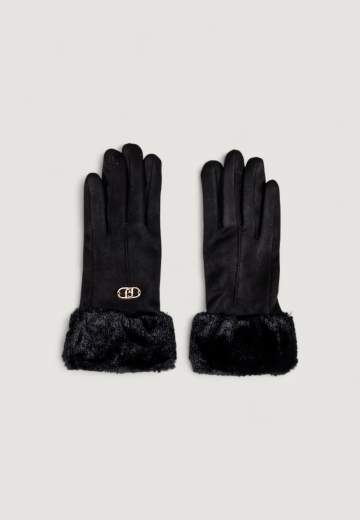 Guanti animalier.Guanti effetto scamosciato, Logo in metallo, Dettaglio animalier in pelliccia sintetica.