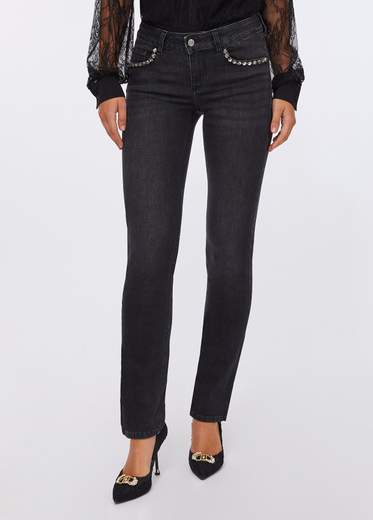 Jeans slim con strass.Jeans in denim di misto cotone stretch, Tagli bottom up che ridefiniscono le forme con eleganza, donando armonia e sostegno senza rinunciare al comfort, Lavaggio used, Vita regolare, Gamba slim, Modello cinque tasche, Strass applicati, Salpa logata, Logo in metallo sul retro, Chiusura con bottone e zip coperta.