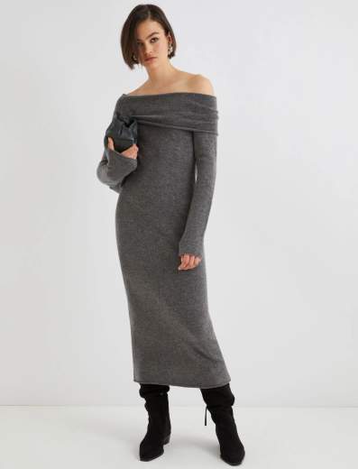 Abito in maglia merinos .Naturalmente aderente, l'abito in maglia si arricchisce di uno scenografico sollo ad anello, che lascia scoperte le spalle. Da completare con stivali e pochette morbida.