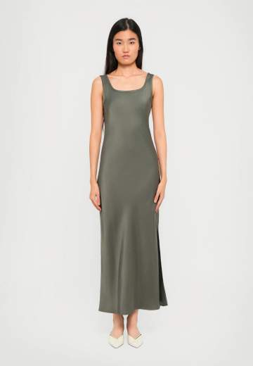 Tessuto principale contenente materie prime derivanti dalla cellulosa del legno, fibra ricavata nel rispetto del patrimonio forestale, Abito in raso, Fit aderente, Scollo stondato davanti e dietro, Spacco laterale sul fianco sinistro, Modello smanicato con bordi rimessi.