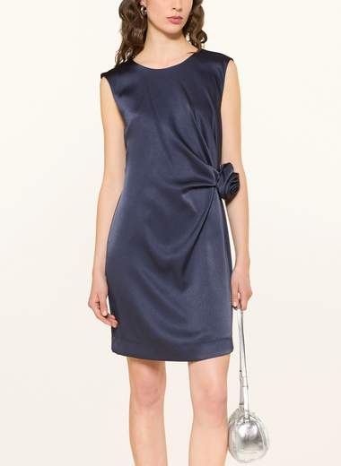Abito smanicato in satin.Corto, smanicato, con fiore e drappeggio sul fianco per una silhouette dinamica: questo è l'abito più versatile di stagione, perfetto per l'ufficio o le serate con gli amici.