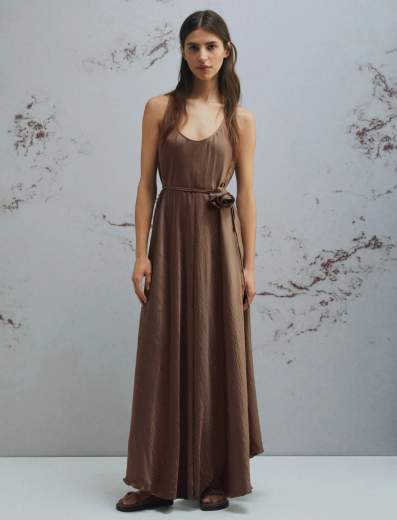 Abito in twill crinckle.Si indossa con un gesto, e sei pronta ad uscire: è l'abito in twill con effetto crinckle, materico al tocco ma leggerissimo. Da completare con cintura abbinata a fiore e sandali per un summer look a prova di città.