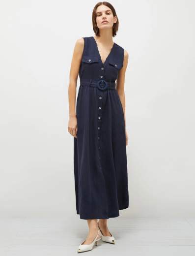 Abito smanicato in lino.Una femminilità libera e sofisticata emana da questo nuovo abito in puro lino: la costruzione a chemisier e la gonna svasata ne fanno un capo versatile da indossare in ufficio o nei momenti off duty. Aggiungi sneaker o sandali per modulare lo styling.