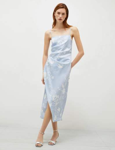 Abito in satin stampato.Tagli diagonali, stampe romantiche e un satin che scivola sulla pelle: l'abito estivo è dedicato alle occasioni più speciali. Indossalo con uno spolverino leggero e sandali a stiletto.
