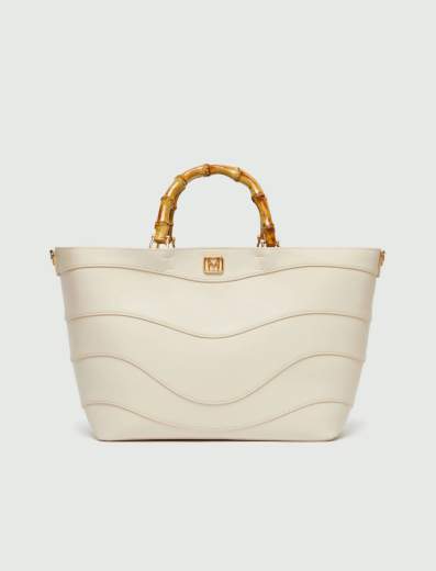 Shopping bag grande.Capiente e super versatile, la shopping bag grande gioca con rimandi estivi come le trapuntature a onda e il manico in bambù. Abbinala ai blazer destrutturati o ai denim, sarà sempre perfetta.