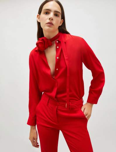 Camicia in crêpe con cintura a fiore.Fluida e leggerissima, la blusa in crêpe emana femminilità in ogni dettaglio. La cintura con maxi fiore di tessuto si può annodare in vita o al collo, per giocare con lo styling.