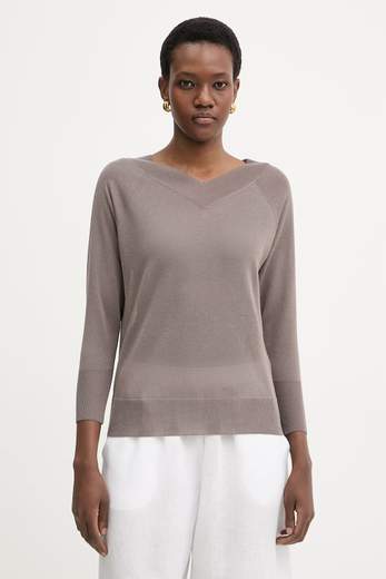 Maglia con scollo a V.Sono i dettagli a fare la differenza. Come in questa maglia dall'aspetto tulle, mano soffice, superficie da carezzare, un gioco di calature che intercetta lo scollo e lo rende protagonista anche sulla schiena.