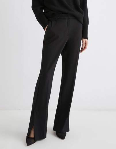 Pantalone in jersey punto Milano di misto viscosa stretch, Fit aderente, Chiusura con gancio a uomo e zip nascosti, Cintura con passanti, Tasche laterali alla francese e posteriori con filetto, Spacco laterale alla caviglia con orlo impunturato.