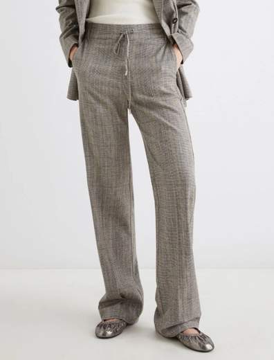 Pantalone in saglia fluida.Nuovo pantalone dalla costruzione jogger che mixa l'eleganza del tessuto chevron con il tocco informale della coulisse in vita. Super confortevole, si abbina al blazer coordinato e ad una canotta stretch per city look dal mood contemporaneo.