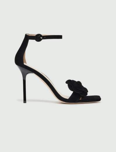 Sandalo in suede con tacco sottile.Impossibile resistere al fascino del sandalo nude look: con clip a fiore rimovibile sulle dita, slancia la figura e aggiunge sensualità. Provalo con i pantaloni di giorno o abbinato ad una gonna per la sera.