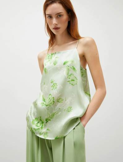 Top svasato in seta.Dedicato a chi cerca un'eleganza delicata e dal tocco contemporaneo, ecco il top con spalline sottili in pura seta. Leggero come una carezza sulla pelle, si illumina con la stampa foliage tutta nei toni della primavera.
