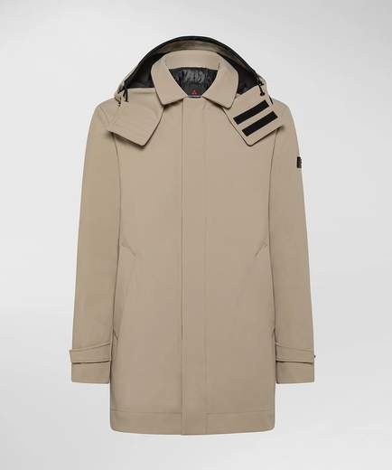 Trench liscio a tre strati: la tela di nylon stretch sull'esterno racchiude una leggera membrana che protegge dagli agenti atmosferici ed è rifinita da una rete interna in jersey indemagliabile. Il trattamento Teflon TM EcoElite rende il capo idrorepellente, attraverso l’uso di sostanze non inquinanti e rinnovabili. Dalla vestibilità regular e dalle linee eleganti, questo capospalla rappresenta uno dei bestseller di Peuterey. La funzionalità del modello è mutuata dai capi da trekking e l’aspetto è pulito ed essenziale. Cappuccio staccabile a collo alto con catarifrangente e coulisse. Collo a camicia, da portare anche rialzato, con bavero antivento con chiusura a strappo. Chiusura con zip nascosta a doppio cursore e bottoni a pressione. Gancio metallico per chiusura rapida. Tasche a filetto, regolatori ai polsi. L'imbottitura in Primaloft® offre un eccellente comfort termico in uno spessore sottile.
