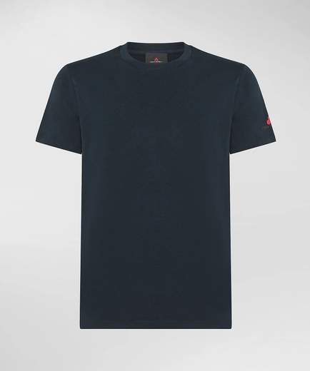 T-shirt girocollo in jersey di cotone stretch con logo stampato minimal sulla manica sinistra. Un capo essenziale, espressione per eccellenza di versatilità, realizzata in materiali di qualità che garantiscono comfort e durata. Questo modello è il fondamento su cui costruire ogni guardaroba estivo, offrendo infinite possibilità di abbinamento per un look sempre attuale.