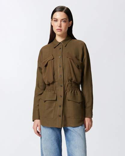 ORAMAI OVER SHIRT LINO.Giacca leggera dalla silhouette overshirt in lino e viscosa con parte posteriore realizzata in leggerissima georgette dall'effetto semitrasparente. La giacca camicia comprende colletto a punta e quattro fra taschini e tasche applicate, tutte dal volume maxi. L'inserto elastico in vita, caratterizzato ed evidenziato da punto smock arricciato, è completato con coulisse regolabile, per stringere o allargare la giacca in corrispondenza del punto vita.