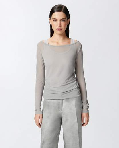 Maglia femminile a maniche lunghe da donna in leggerissimo jersey crêpe di misto cotone effetto garza, che conferisce al tessuto un aspetto semitrasparente; per questo motivo, la maglia a maniche lunghe è completa di un top a canotta che si può indossare sotto per attenuarne la trasparenza e ottenere un effetto coprente.