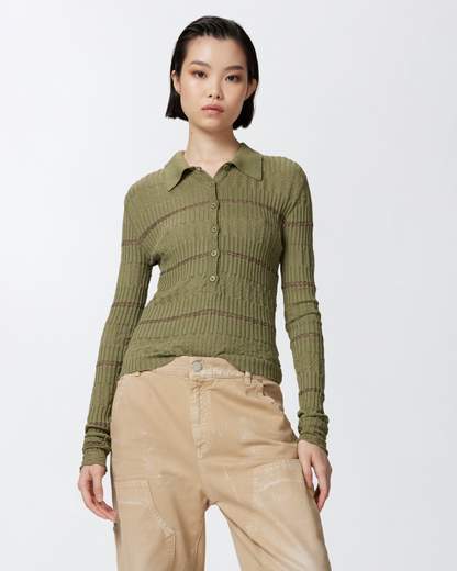 JANNU POLO COTONE SETAPolo a maniche lunghe in prezioso filato di misto cotone e seta lavorato a costine con motivo punzonato, che aggiunge un dettaglio femminile, e fantasia a righe orizzontali con filo metallizzato, per un tocco scintillante e originale. La maglia a polo dalla linea aderente è completata da etichetta logata sul retro del collo.