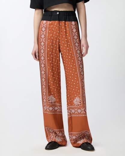 SPIRITO PANTALONE TWILL.Pantaloni lunghi wide-leg in fluido twill di viscosa personalizzato con stampa bandana all-over, mentre la parte superiore è realizzata in georgette di viscosa monocolore, per creare un effetto a contrasto. I pantaloni lunghi sono caratterizzati da vita con elastico e passanti per cintura, cavallo rilassato e gamba dalla linea dritta e larga, enfatizzata dalla leggerezza del tessuto. Chiusura con zip e bottone in vita.