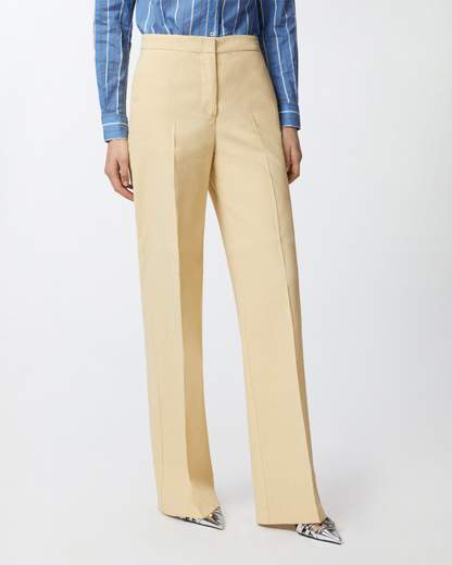 JACOPONE PANTALONE LINOPantaloni da donna in leggero tessuto di misto lino e viscosa stretch caratterizzato da una linea ampia, raffinata e rifinita con piega centrale sia davanti che sul retro della gamba. I pantaloni ampi sono completati da tasche sui fianchi e tasche a filetto sul retro, con chiusura con zip e gancio a uomo.