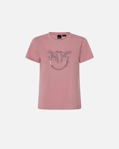 T-shirt da donna a maniche corte in jersey di cotone con maxi ricamo soggetto logo Love Birds davanti, impreziosito con perline e cristalli. L'emblema di PINKO diventa protagonista del capo, regalando anche ai look casual un tocco originale e decisamente scintillante.