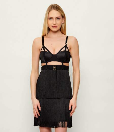 Mini abito in crêpe leggero con frange.Mini abito in crêpe leggero. Il vestito ha spalline sottili che si aprono in motivi geometrici sulle coppe. Si distingue per le frange applicate con doppia balza, a donare un movimento ipnotico. Un dettaglio con logo in metallo dorato sul fascione completa il capo. Vestibilità regular.