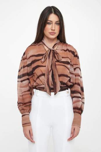 Blusa in chiffon con stampa tigre.Blusa in chiffon. Si distingue per le fusciacche che donano leggerezza, posizionate sullo scollo e in vita sul retro. Protagonista è la stampa all-over a tema tigre, ispirata a colori e fantasie naturali. I bottoni in metallo dorato completano il capo. Vestibilità regular.