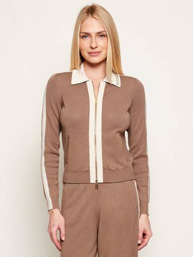 Giacca in maglia con bande in viscosa lucida.Giacca in maglia con maniche lunghe. Si distingue per le bande in viscosa lucida e per la lavorazione jacquard applicata al logo sul colletto. I colori a contrasto enfatizzano il design grafico del capo. La chiusura con zip in metallo dorato aggiunge una nota luminosa. Vestibilità regular.