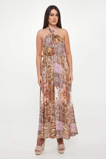 Abito lungo in raso stampato.Abito lungo in raso di viscosa, Stampa cachemire, Elegante scollatura all'americana, Cintone elastico in vita.