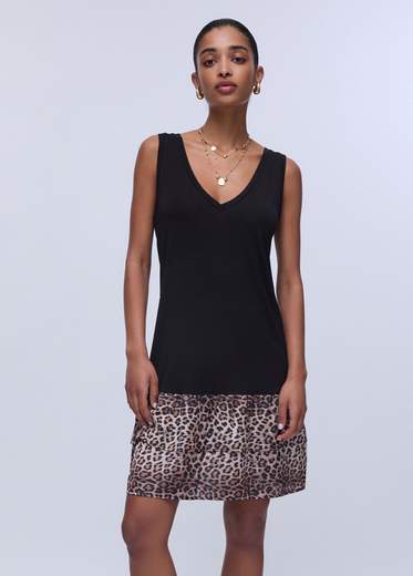 Abito con volant animalier.Abito in jersey di viscosa, Scollo a V, Cintura in vita, Volant con stampa animalier.