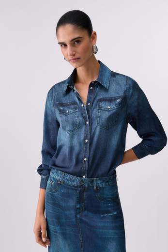 Camicia con stampa digitale.Questa camicia reinterpreta il concetto di dailywear con un tessuto fluido e impalpabile, definito da una stampa digitale effetto denim. Luminosa, inaspettata, sorprendente.