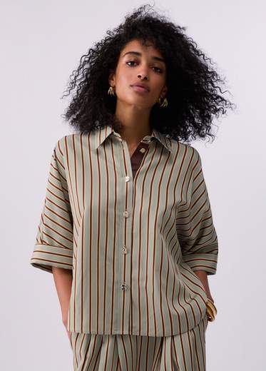 Camicia in rayon a righe.Una camicia dalla mano sorprendentemente morbida. Realizzata in rayon con trama rigata, scivola sulla silhouette con una caduta fluida e leggera. Indossala in coordinato con i pantaloni per un’eleganza rilassata.