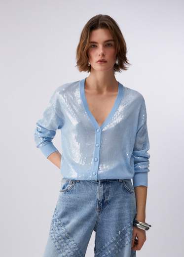 Cardigan con paillettes.Tessuto principale: 70% Viscosa, 30% Poliammide| Ricami e decorazioni: 100% Poliestere