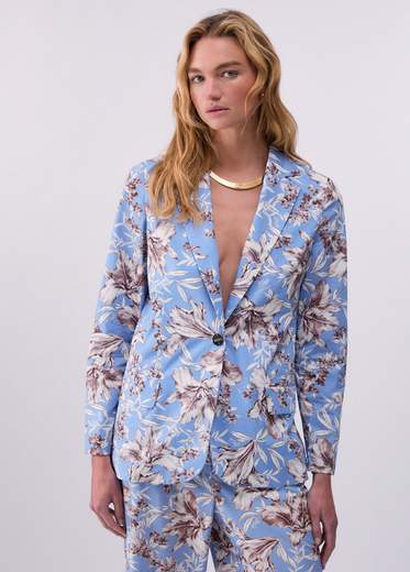 Blazer in popeline stampato.Un soffio d’azzurro per accendere il nuovo tailoring. Questo blazer in popeline reinterpreta la giacca elegante in chiave glam con uno sfondo etereo light blue e una raffinata stampa floreale, perfetto con denim e slingback.