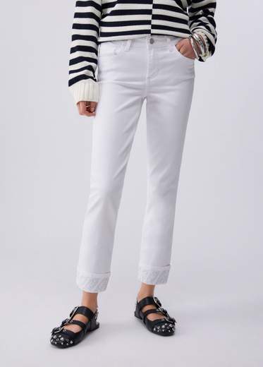 Pantaloni skinny con risvolto e strass.Pantaloni in drill di cotone, Modello cinquetasche, Vita media, Tagli bottom up che ridefiniscono le forme con eleganza, donando armonia e sostegno senza rinunciare al comfort, Gamba skinny, Lunghezza sopra la caviglia, Risvolto con strass.