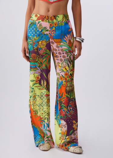 Il capo statement per le giornate d’estate. In raso stampato, questi pantaloni hanno una mano fluida che valorizza la gamba ampia, mentre la fantasia multicolor li rende perfetti per city-break e occasioni speciali. Sceglili con sandali flat e top coordinato per un look d'ispirazione vacanziera.