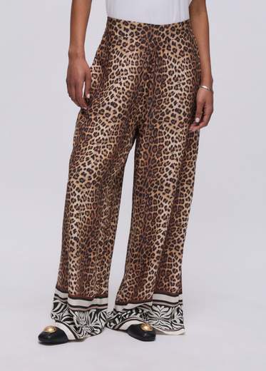 Pantaloni animalier.Pantaloni in tessuto leggero, Filati in pura viscosa, Stampa animalier, Cintone con inserto elastico posteriore, Comode tasche, Dettaglio zebrato sul fondo.Tessuto principale: 100% Viscosa Leggi tutto
